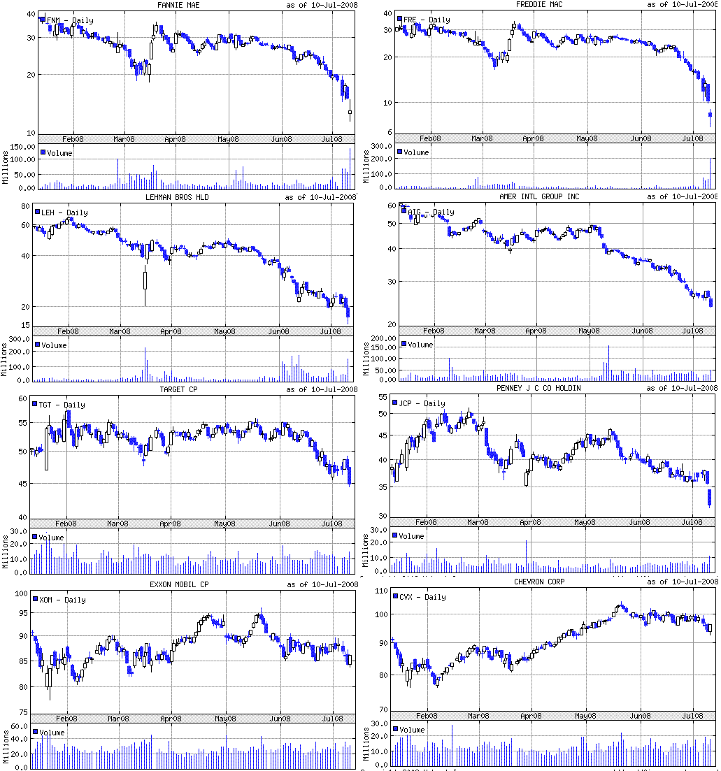 日本時間の昼ごろに出たニュース。ファニーメイとフレディマックはどうあっても潰せないところなので、ダメだったら政府がなんとかする、というのは既定路線ですが、検討中ってニュースだけ出ても、マーケット参加者はどっち行こうか迷いますね。
