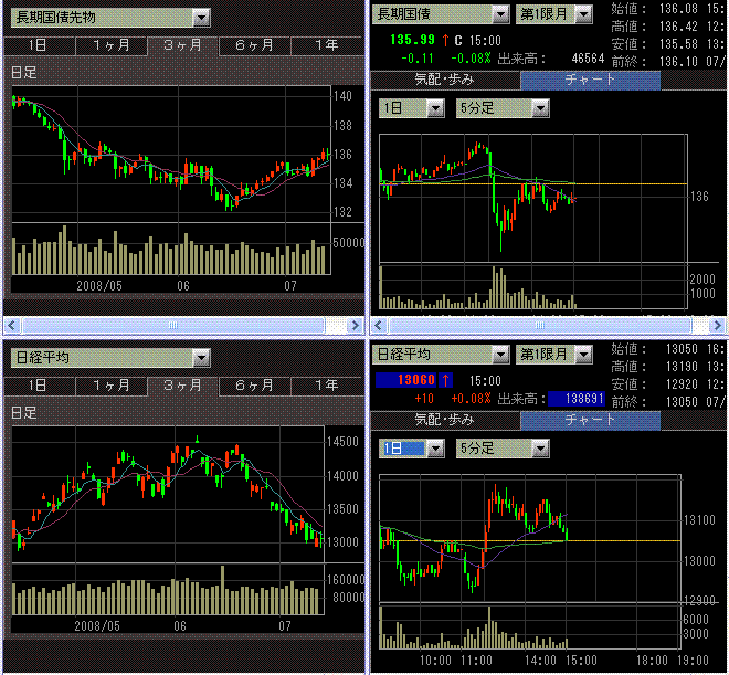今日は7月SQ日。SQ値は、13,155.01円となりました。前場は幻のSQ値状態だったのですが、後場に「米政府がファニーメイとフレディマックを政府管理下に置くことを検討」とのニュースが流れたことから、先物に一気に買いが入り日経平均は前日比プラスに浮上。しかし、あくまで検討中であり実現するとしてもまだ先のことなので、短期筋も迷い気味で先物は上下にフラフラ。引けに現物にバスケット売りが出たようで、結局日経平均は小幅安で引けました。