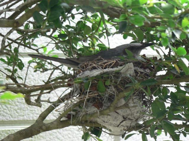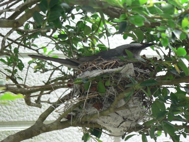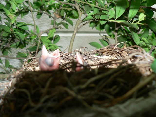左:7月8日裏庭のツゲの木に鳥の巣発見、窓からパチリ