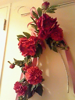 玄関には絵などをかけられるフックがついているのですが、そこにはいつも造花などを組み合わせて、飾っています。