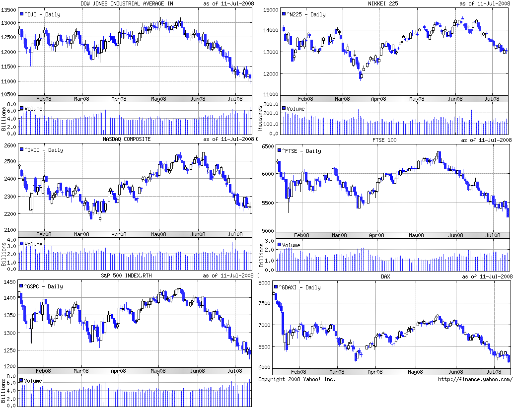 週間では、ダウは-1.7%、ナスダック指数は-0.3%、S&P500は-1.7%の下落率でした。今週は、ダウに続いてS&P500も高値からの下落率が20%を超えベアマーケット入りしました。ダウ、S&P500、FTSE、DAXともに3月安値を下回り、年初来安値を更新しています。今週の株式相場は、政府系住宅金融機関であるファニーメイとフレディマックの資本に対する懸念に振り回されました。また、金融機関の追加損失への懸念が燻り続け、金融株も下落基調でした。バーナンキFRB議長とポールソン米財務長官が、潰れるべき金融機関は他に被害が広がらないようにして秩序だって潰した方が良いといった内容の発言をしたことから、体力的に厳しいと思われるリーマン、メリルリンチ、ワコビアといったところが大きく下落しました。
