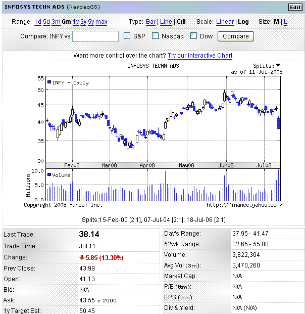 インフォシスが四半期決算を発表。通期業績見通しの上方修正を行いましたが、株価は大幅下落しました。