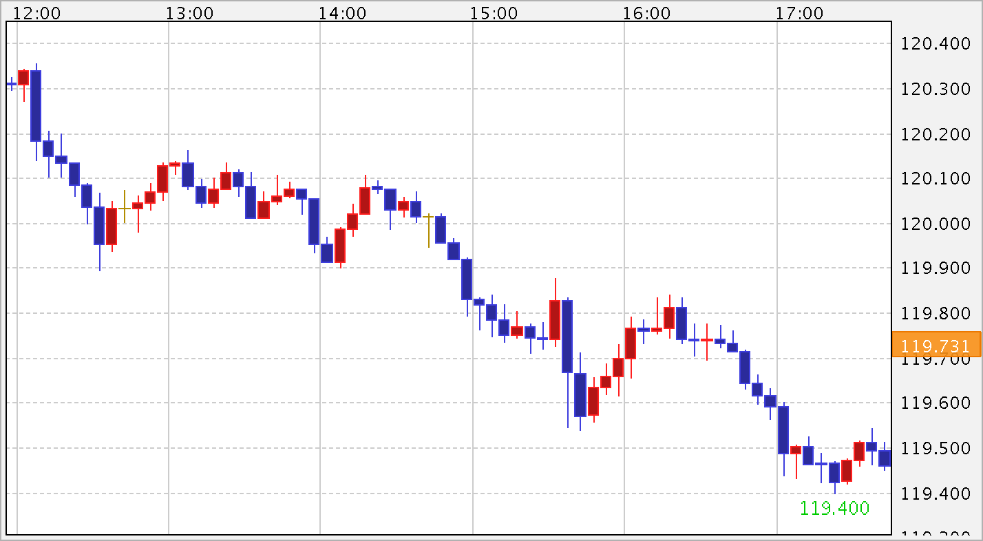 海外市場は、1ドル=119.80〜120.40円台での上下。欧州市場では、120.00円ラインを背にして底堅く反発し、高値をつける場面もありました。NY市場では、NYダウが値を下げており、つられる形で安値をつけました。ただ、売り一巡後は長期金利(10年債利回り)の上昇もあり、120円台に持ち直しています。