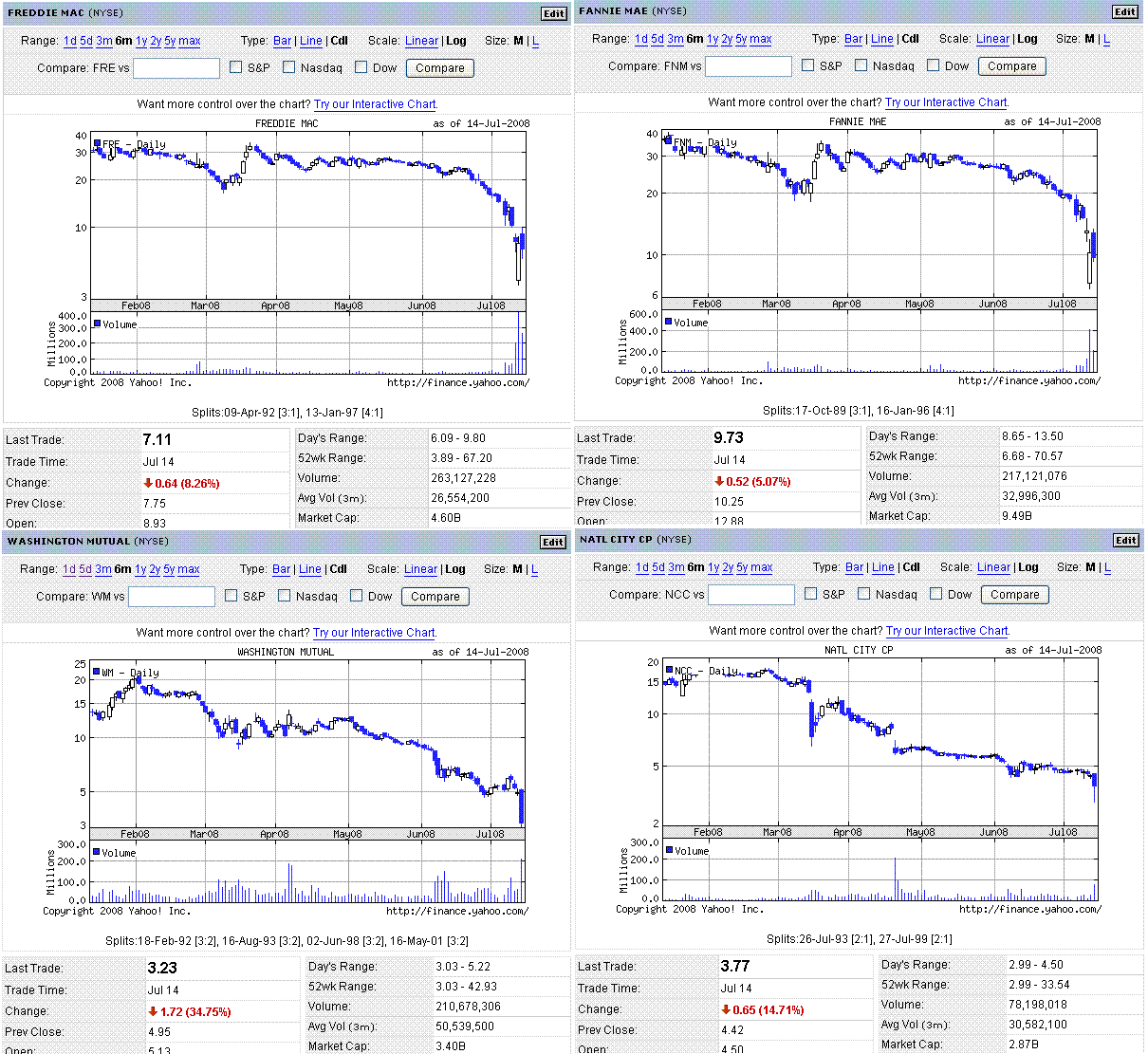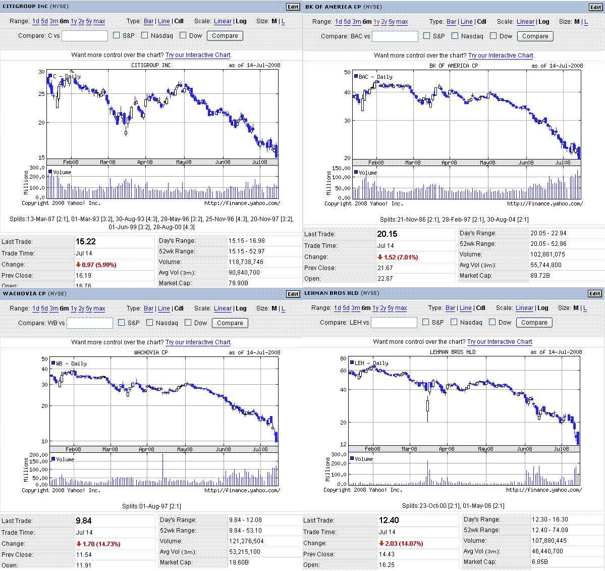 支援策が発表されたファニーメイ、フレディマックの株価は下落。たとえ資本注入されても既存株主が救われるわけではないので(損失計上⇒資本注入ってやれば発行済株式についての一株当たりの価値が下がっていく)、住宅市場が悪化し続ける限りは、株価が上がるのは難しいのでしょう。これらのGSEの債券は、日本や中国の機関投資家がかなりの量を持っているみたいなので、もし債券がデフォルトしたら大騒ぎになります。