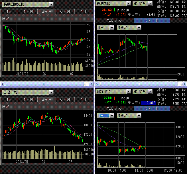 米株安を受けて大幅下落。CMEの日経平均先物の終値よりも安く始まり、GLOBEX米株価先物安とアジア株安から後場寄りにもう一段売り込まれました。ファニーメイ、フレディマックの債券を保有していることが嫌気され、銀行株が弱かったです。6月首都圏マンション販売戸数が振るわなかったことから、不動産株も売られました。トヨタは年初来安値更新。配当利回り3%でも売り込まれるのは厳しいです。