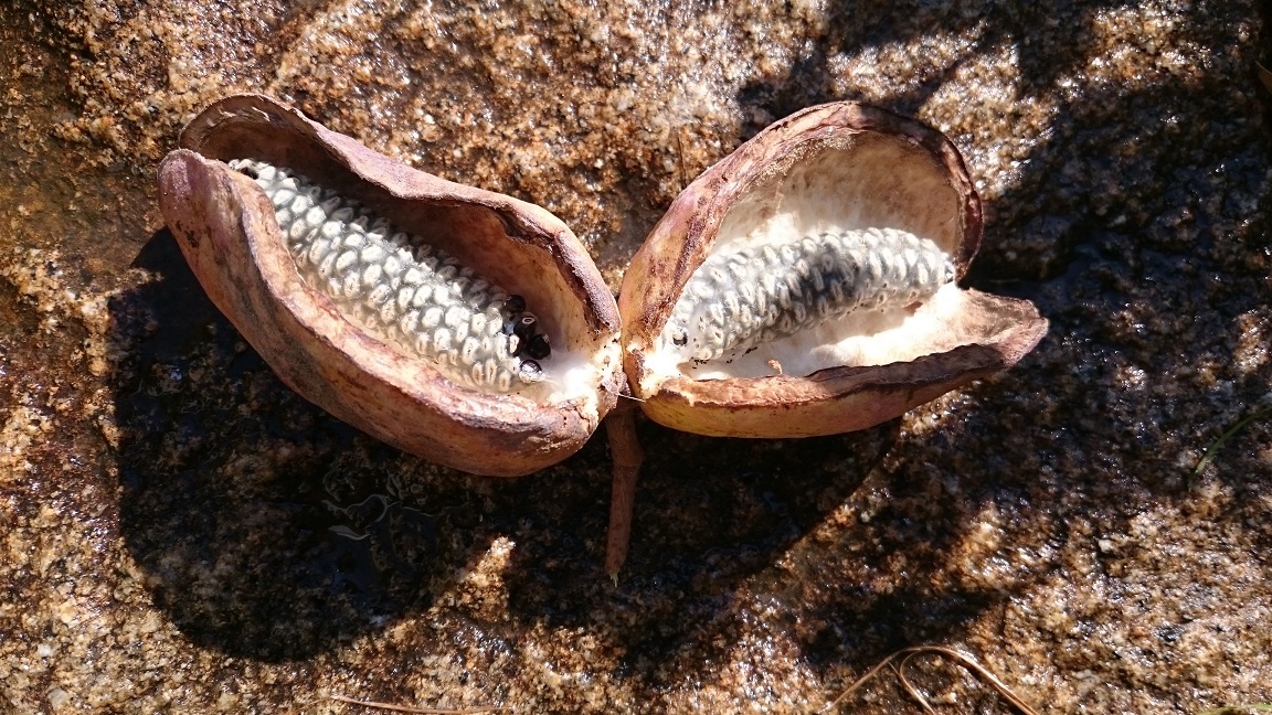 自宅の剪定してたら、奥のほうから、アケビの実が出てきた。