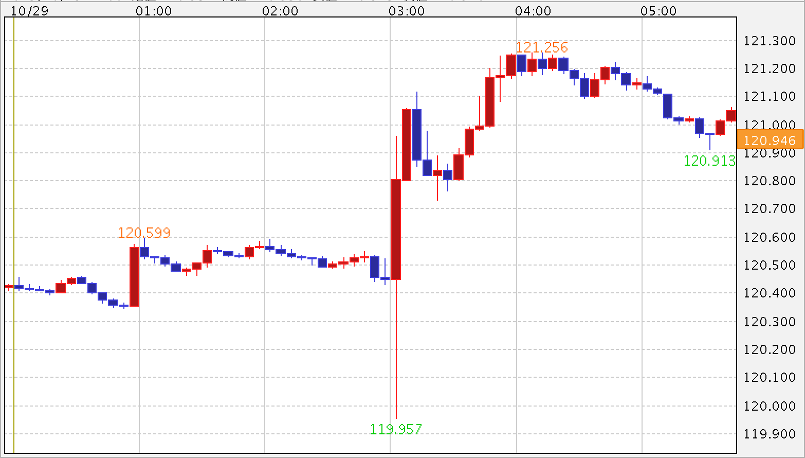 今日は121円台を維持できずといった感じで反落していますが、引き続き底堅く推移しており、明日の日銀イベント待ちといった向きもありそうです。また、今夜は(米)7〜9月期GDP・速報値も予定されていますので、それらを見てといったところでしょうか。