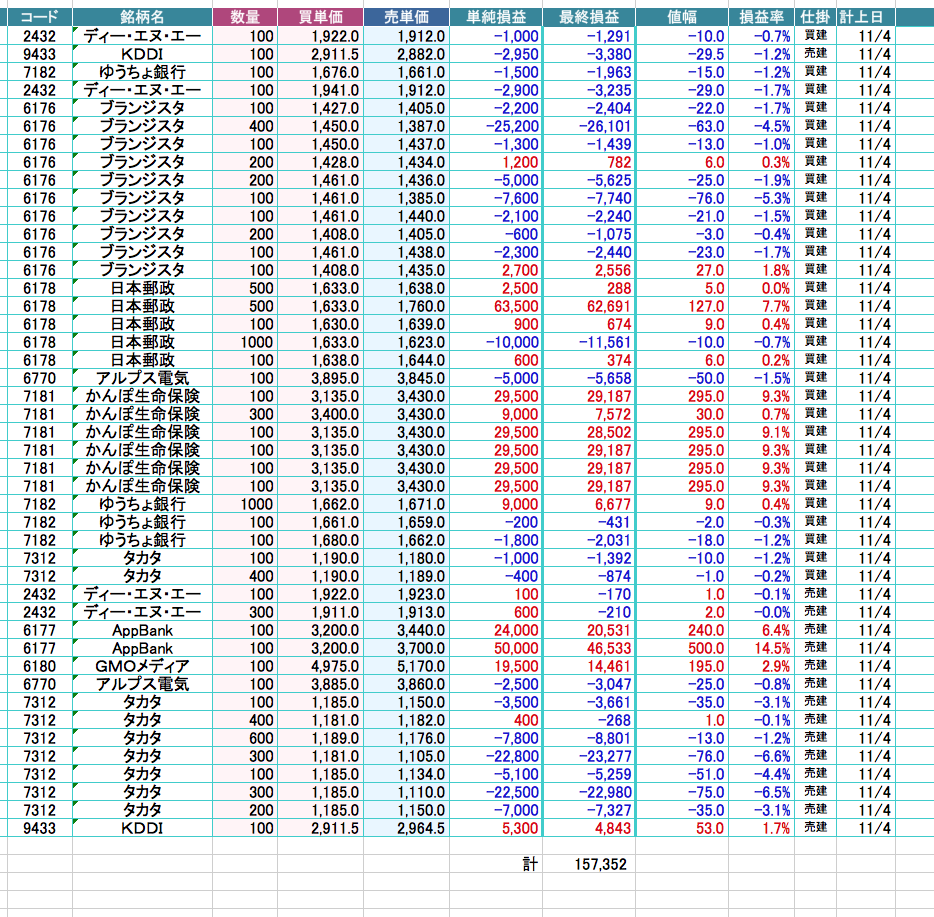 1日約定合計+157,352円(手数料・税考慮済)