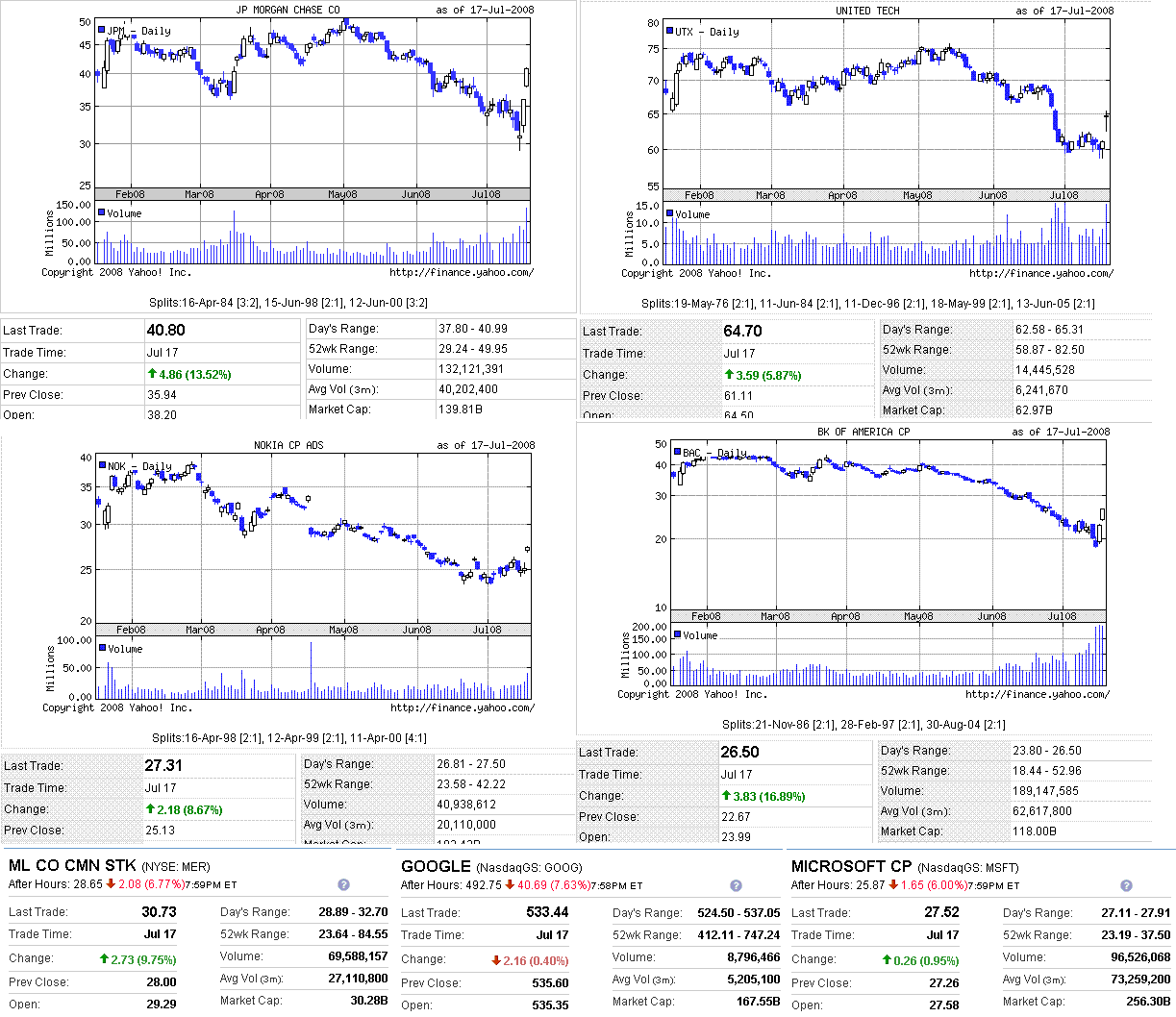 引け後に、メリルリンチがひどい決算を発表し、グーグルとマイクロソフトの決算も冴えなかったことから、GLOBEX米株価指数先物が売られました(日本時間朝方で、ダウ-100ドル、ナスダック-15ポイント相当だったと思います)