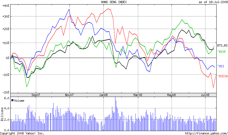 原油価格が下がって、ブラジルがやや弱い動きに。画像のチャートは、赤:インド 青:香港 緑:ブラジル 黒:ロシア です。先週までは原油価格が上昇してたので、資源国のブラジル・ロシアは強い動きでした。