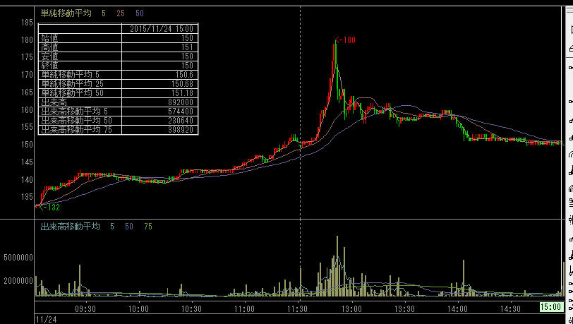 寄り付きは前日と変わらない132円から一時は180円まで急騰した。