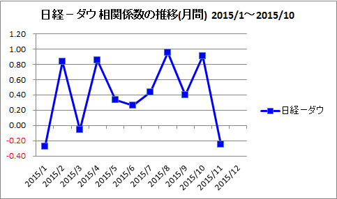 とりあえず、月別に見た相関。Excelで相関係数を計算していますが、1だとピッタンコ同じ動き、0だと無関係、-1だとまったく逆の動きを示していることになります。