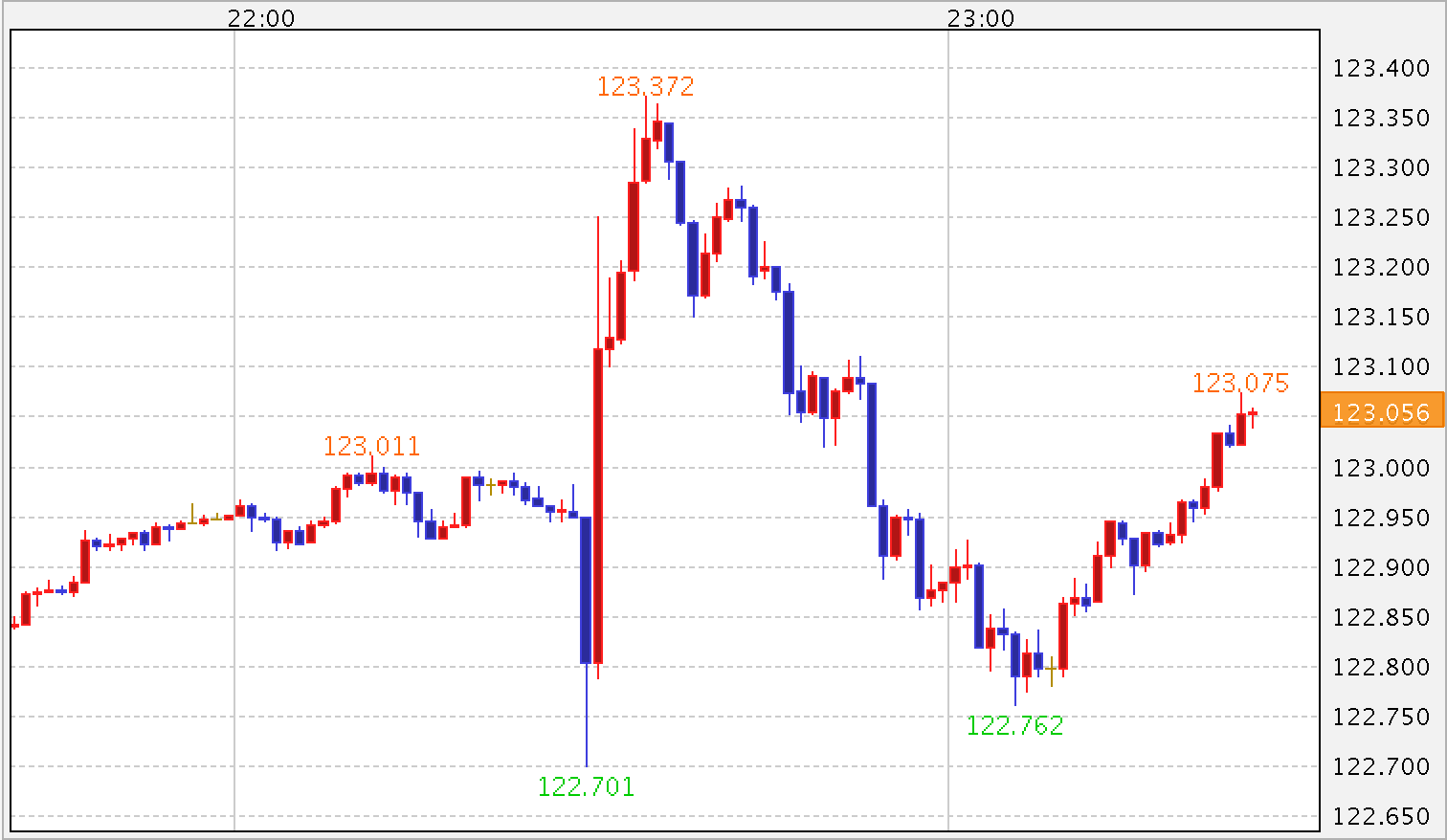 ↑発表直後のドル・円チャート。やはり値動きは限定的でイマイチでした。