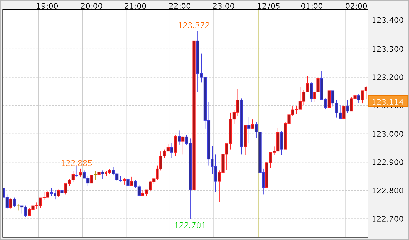 ただ、この辺はすでに市場も十分織り込み済みですので、やや上値を伸ばして123円台にのせた程度で、それほどの反応はありませんでした。