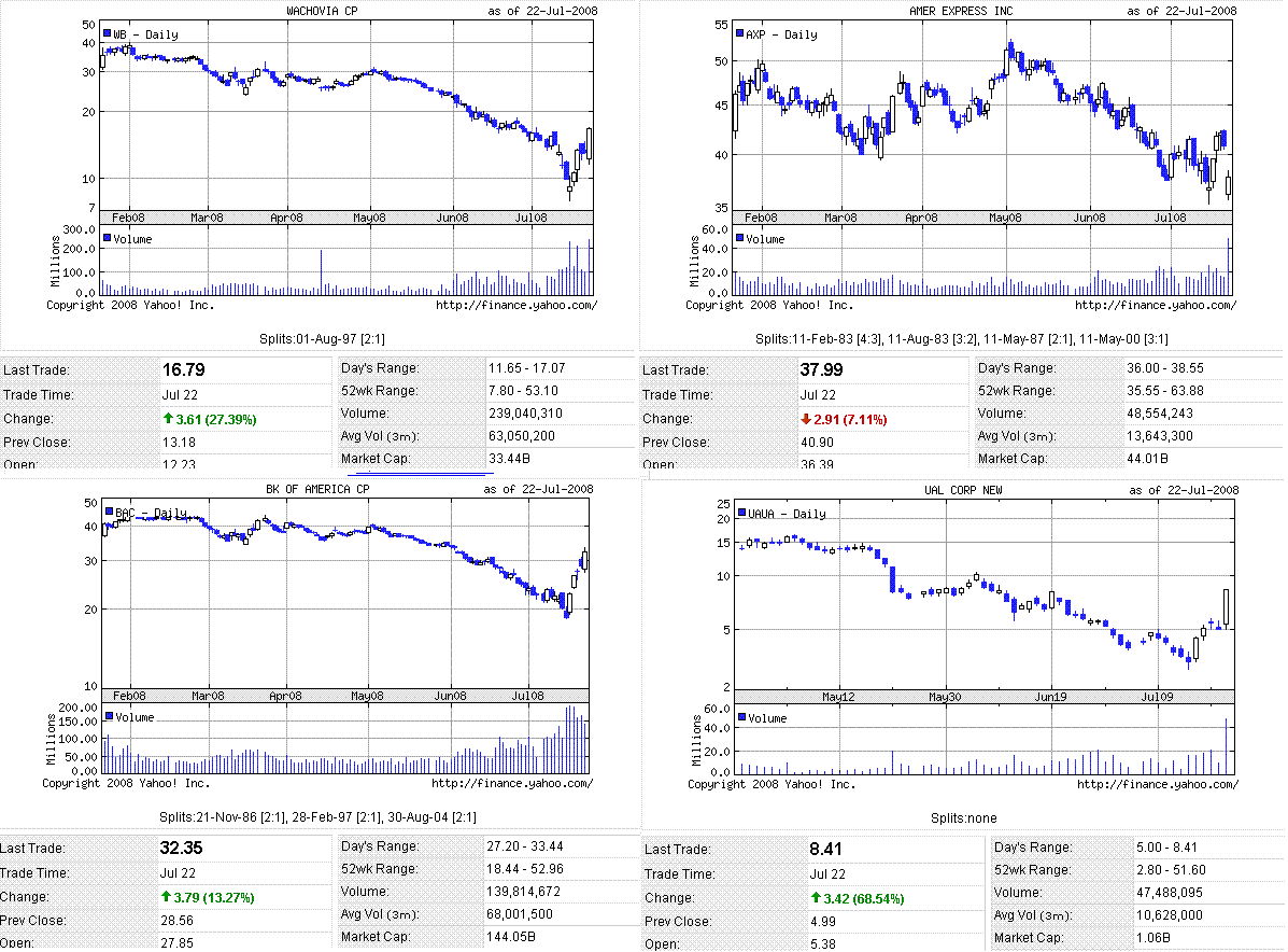 ワコビアの発表した決算は過去最悪の赤字でしたが、新株発行の計画は無いとの見方が好感され大幅高。他の金融株も大幅高しているものが多かったです。前日引け後に決算を発表したアメックスやTIは売られたものの、この日決算を発表したキャタピラーやデュポンなどは買われ、原油価格が下落したこともあり、米株価指数は大幅高となりました。VIX指数は21くらいまで下がってきていて、だいぶ警戒感が薄らいできたようです。