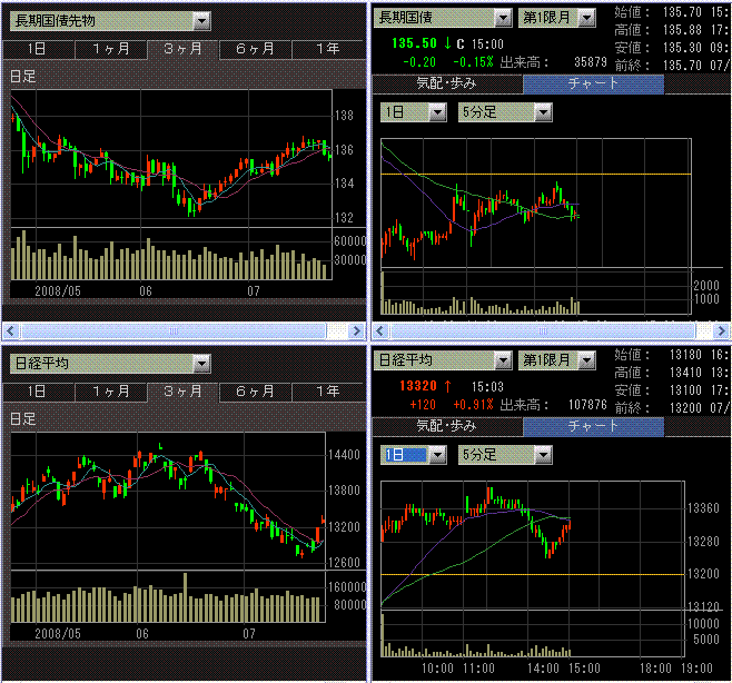 日経平均は、CMEの終値付近で無難に始まり、あとは13300円前後でもみ合い。業種別では、JPモルガンが強気の投資判断を付与した大手不動産、米金融株高を受けてメガバンク・証券・保険、原油安からゴム、製品値上げから化学、といったところが買われました。先物の買い圧力が結構強くて、全体的にはあまり崩れる感じがしないですね。円安なのも日経平均にはプラスです。