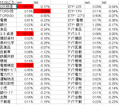 図は、15:00ごろの最良売買気配とNAVとの乖離率です。