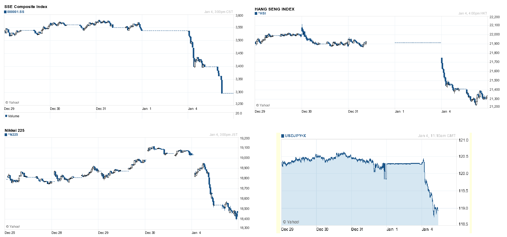 日経平均は前日比で一時600円を超す下げとなった。ドル/円 が119円台半ばと弱含んでおり、輸出株などのさえない値動きにつながっている。弱い内容となった中国の12月製造業PMIが株安・ドル安のきっかけになったとの見方が強いほか、「サーキットブレーカー発動で中国株などの取引が一時停止されたことも市場心理を悪化させている」(国内証券)との声が出ている。