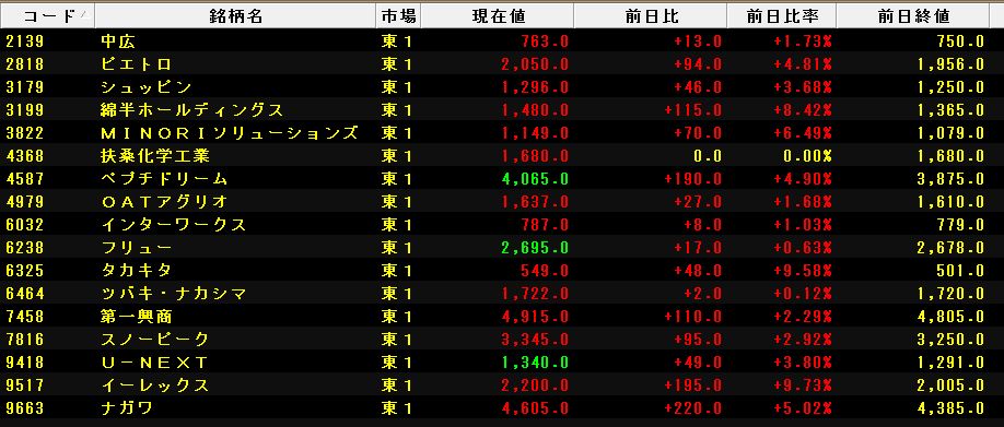 この大暴落の中、12月に東証1部に昇格、上場した銘柄が強い値動きでした。