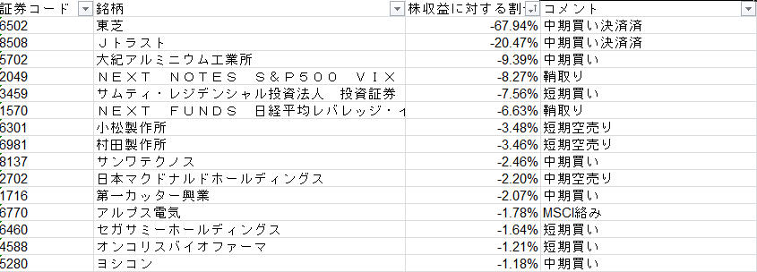 負けている銘柄で東芝とJトラストと大紀アルミとサムティレジ以外は、鞘取りの範囲と言えば範囲での取引。なので、鞘取りの範囲で負けている分にはそこまで気にしてはいない。銘柄の選定を後から見直す為の材料としては大事だが、ここで損を出していても対になる売買で儲かっていれば良い。