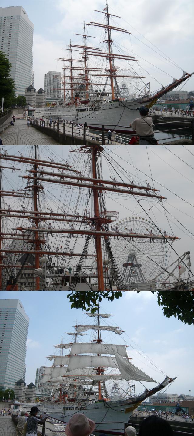 この日は丁度海の日でもあったので、普段はマストを張っていない日本丸も帆を張るいわゆる総帆展帆の日でもあったんですね~♪(写真中央)