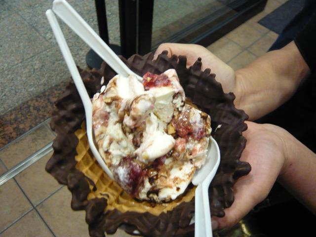 このお店のアイスは美味しいと評判なのですが何時も行列が凄いんです。でも、ちょうどこの日は早い時間だった事もあってか比較的列も短く、ママさんチョイスでバナナスプリットデシジョンを注文、バナナアイスにチョコレートやナッツ、冷凍イチゴをその場で混ぜてもらって出来上がったのが(写真右)これを3人で食べ歩きしながら駐車場へと向かいます(^^)