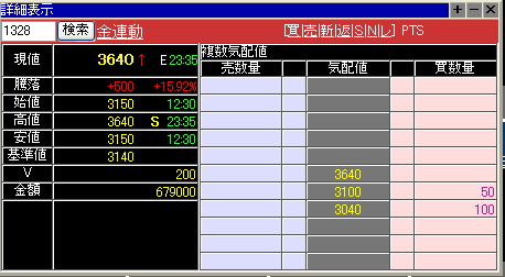 といっても、25日のkabu.comPTSでのことです。いつから、S高買い気配だったのかはわかりませんが、遅くとも20:40には張り付いていました。S高での約定時刻は23:35でした。
