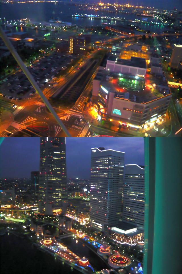 時間的には夜の7時を周った頃ですが、ようやく夕暮れの頃を向かえ、各施設がライトアップを始める頃、ここでみたとみらい地区のシンボルの1つであるコスモクロック(写真中央)に乗り込み横浜の街の夜景見物と洒落込みました(写真右)やっぱりこの辺りは夜の方がより一層綺麗ですもんね(^^)