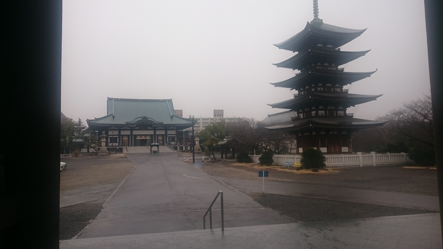 門から見た風景、ここの門は弟子の像が仁王像の代わりに木造で作られているめったに見ない門です。