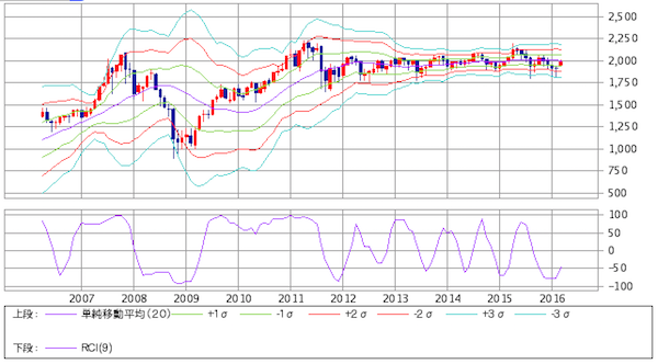 まず直近10年のKOSPIのチャートですが、2011年以降はほぼ一定で、もう3年に渡り狭いボリンジャーバンドの間をスイングしていることがわかります。RCIも綺麗に周期していますが、普通に考えたら遠からず大きく値動きすると考えるべきでしょう。