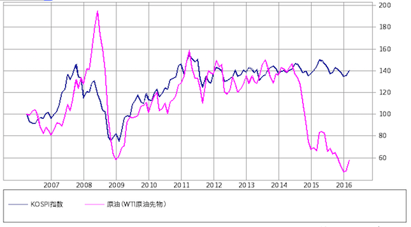 次にKOSPIとWTI原油先物の比較チャートを見てみましょう。2014年半ばまでは綺麗に重なってるのがわかると思います。これは偶然でもなんでもなく、韓国経済が中国と米国への輸出に大きく依存しており、その中国と米国の経済は2001年以降はオイルマネーに依存していたからに過ぎません。だから原油価格が上昇すれば韓国経済は潤い、下落すればその影響が直撃する様な経済構造だったのです。