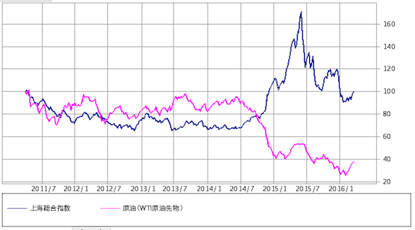 そこで気になるのが2014年半ば以降ですが、KOSPIとWTI原油先物が大きく乖離していることがわかります。実は2011年以降は原油価格にかかわらず貿易輸出額が5200億ドル前後とほぼ一定であるためです。じゃあ、なぜこんなことが起こったのか?それは次の上海総合指数とWTI原油先物の比較チャートを見たらわかります。原油価格の下落と反比例する様に上海総合指数が上昇してます。オイルマネーと入れ違いに中国ではバブルが発生し、いわゆる「爆買」が韓国の輸出を後押ししたのです。オイルマネーが後退したにもかかわらずなぜ中国でバブルが起こったかについては…また別の機会にでも。
