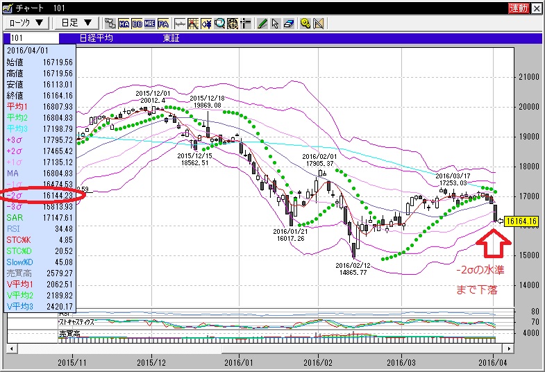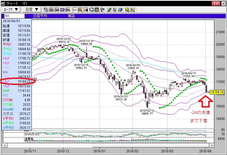 別添えの画像の通り、マイナス1σを超えてマイナス2σの水準となる16144円近辺まで下落。