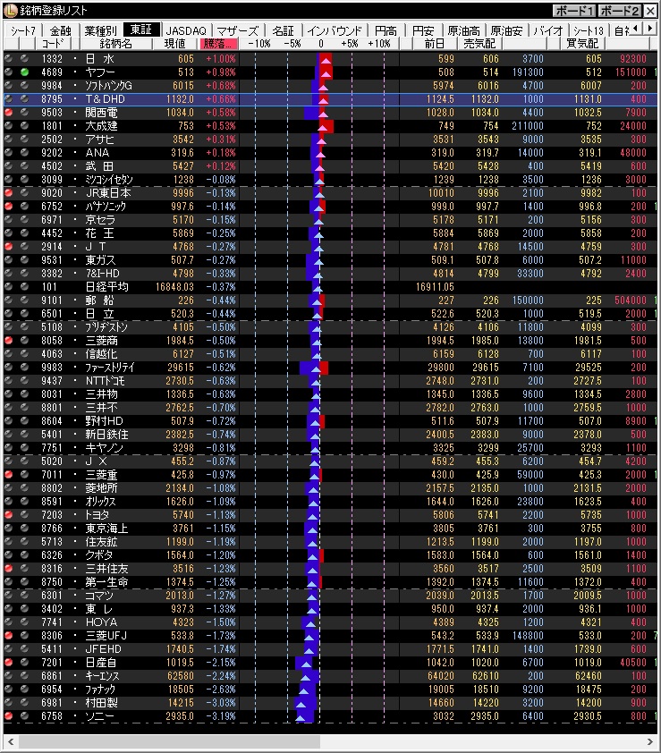 業種別にはこれまで高かった銘柄(自動車、銀行、機械)の下落が多かった。