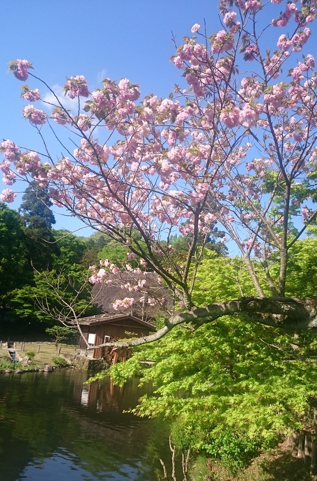 新緑の中、八重桜と水車があたらしく設置され、名古屋市は金がある。