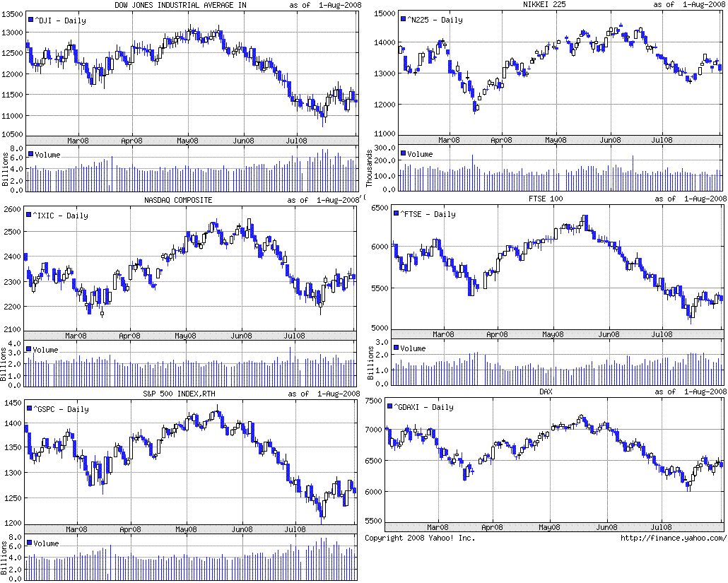 金融株は下げ渋る動き。メリルリンチの思い切った行動は、金融株のアク抜けにつながるのか。住宅価格は相変わらず下げ続けているようです。GDPは、在庫調整の影響が大きいようですね。7月ISM製造業景況指数でも在庫の減少が目につきました。過剰在庫が無いのは良いのですが、何か緩やかに縮小していく気がします。