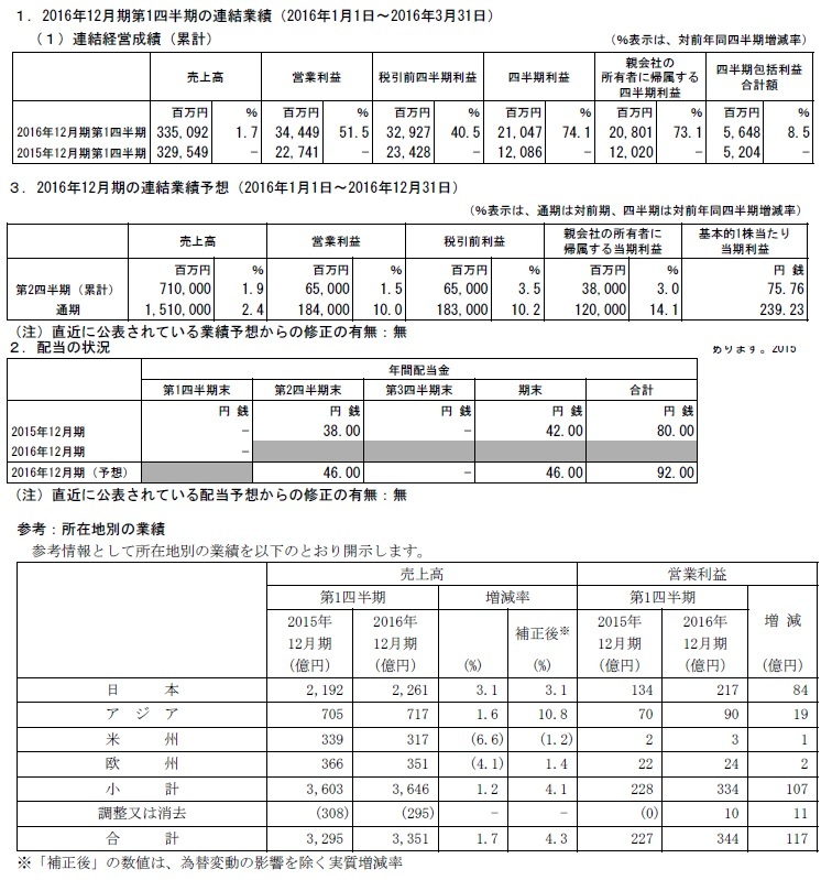 花王がH28/12月期の第1四半期決算を公表しています。