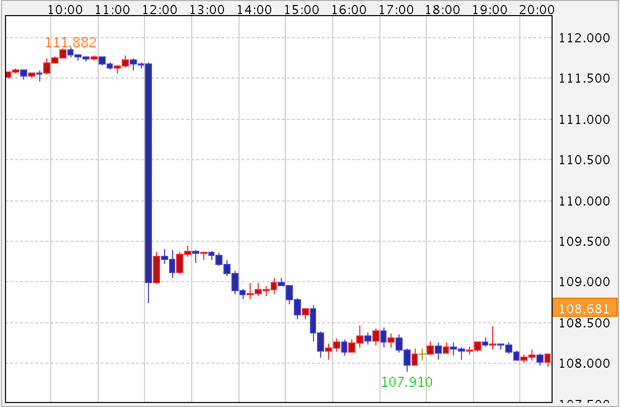 今日は序盤からドルを買い戻す動きが優勢でしたが、(日)日銀金融政策決定会合・結果発表で現状維持が伝えられると、これまで追加緩和期待で進んできた相場が一気に巻き戻され、4円近い下落を記録しています。