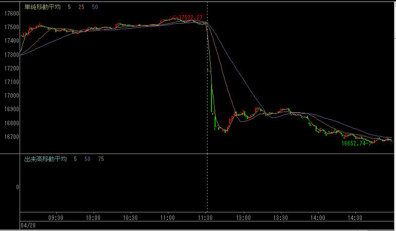 前場のピークからの変化は為替は111.70円から3円近く円高、日経平均は800円近くの下落となった。