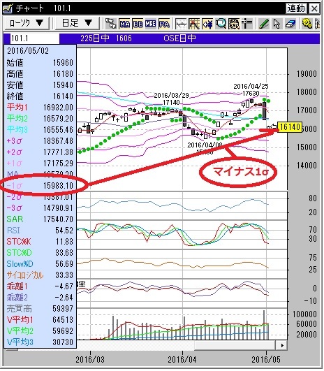 朝方に16000円割れしたがマイナス1σの水準に到達(別添え画像参照)すると下げ幅を縮小する動き。