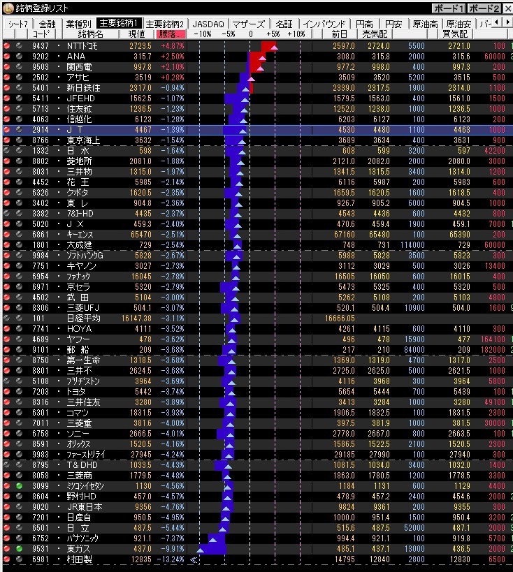 ところで月曜日は好決算銘柄であったNTTドコモ、ANAや鉄鋼関連などは買われたが、