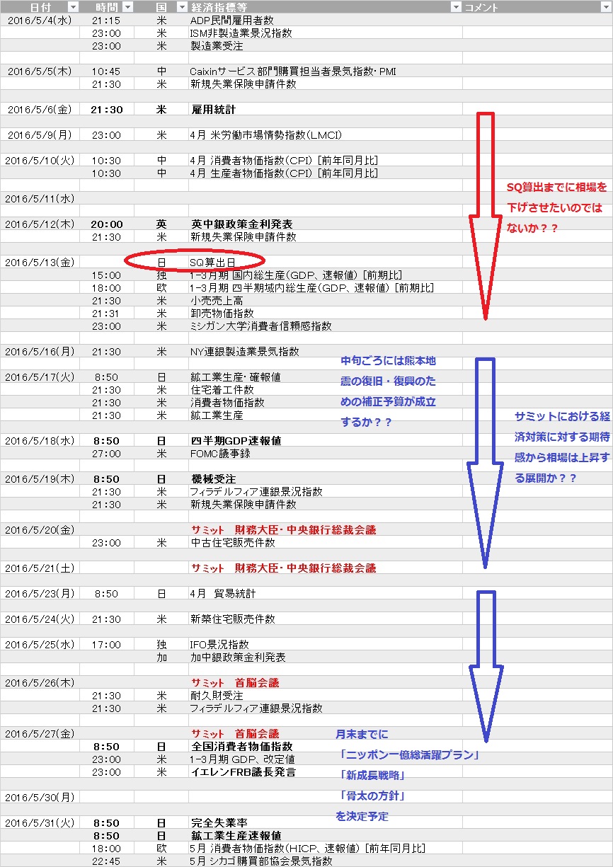 ただし、④のGDPや機械受注の公表によって相場が動きうるので5/18-19の両日の相場変動に注意が必要と思われます。