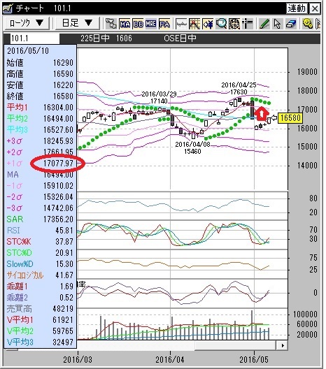 25日平均線を上抜けて、次は清算値として以外にも+1σの水準である17,000円近辺が直近の目安となる可能性が強そうです。