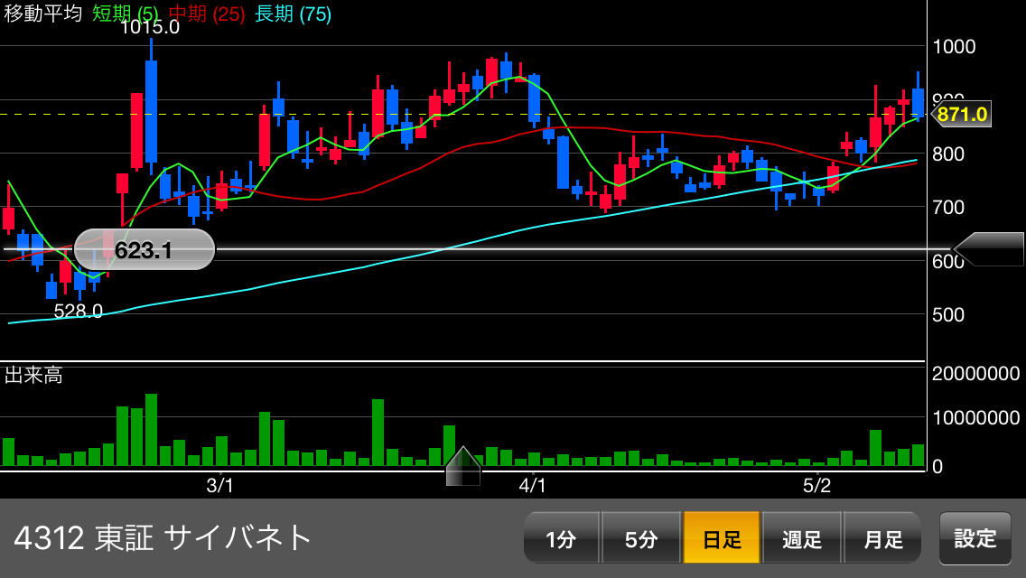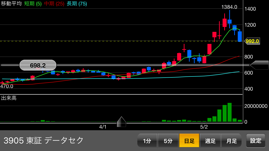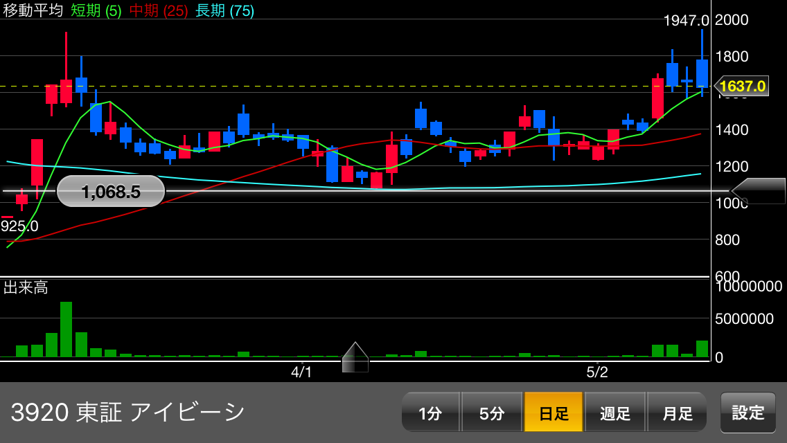 1,200円前後を下限目安に2,000円方向。2,000円大台乗ると上場来高値3,075円まで上値スカスカ。