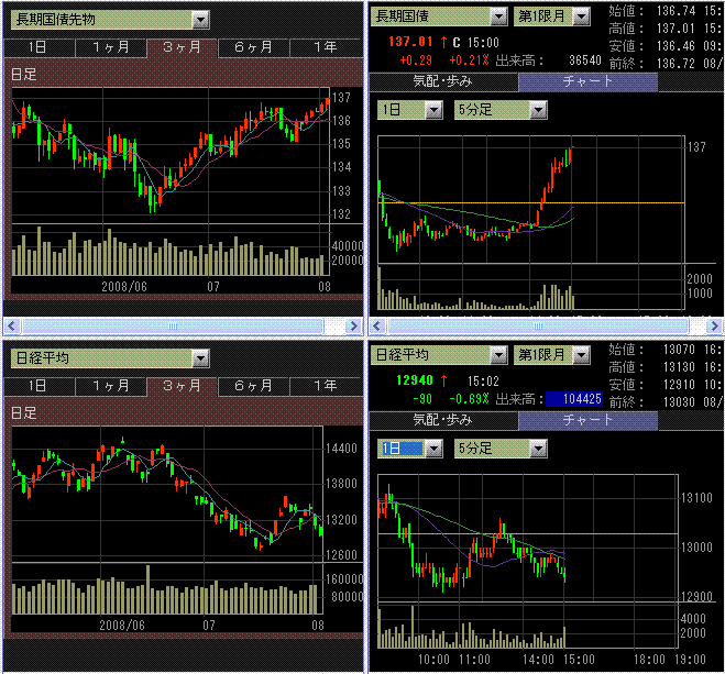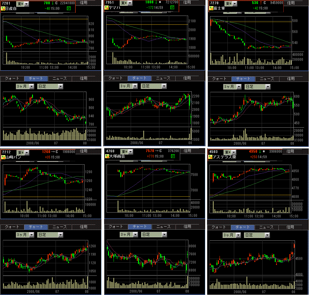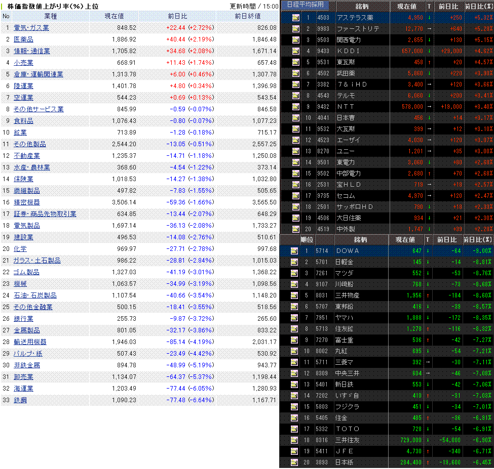 日経平均は続落。業種ごとの動きは、先週までの流れがさらに強くなった感じでした。鉄鋼、非鉄、機械、自動車、海運など景気循環株がメタメタに売られ、電力、医薬品などのディフェンシブセクターが買われました。今日の動きについては、ディフェンシブへの単純な資金の逃避と考えるには、少し極端ではないかと感じました。