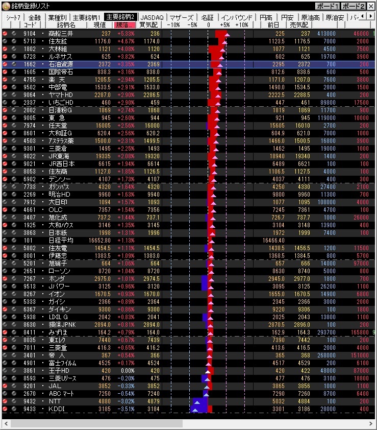 日本株は続伸。前営業日対比で186.4円高の16652.8円。