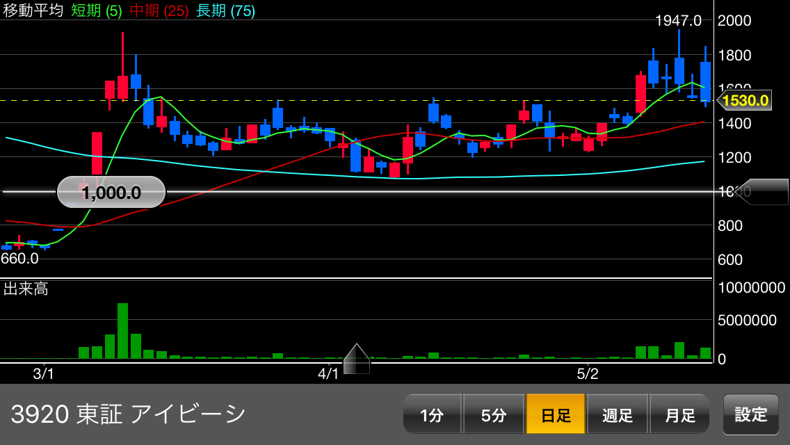 5/17株価1,777(+300)⇒終値年初高値1,630円達成