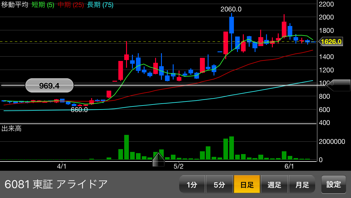 1,200円前後を下限目安に2,000円方向。2,000円大台乗ると上場来高値3,075円まで上値スカスカ。