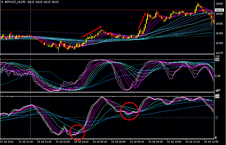例として、下のチャートは、日経225(JPN225 CFD)の5分足(7月13日)