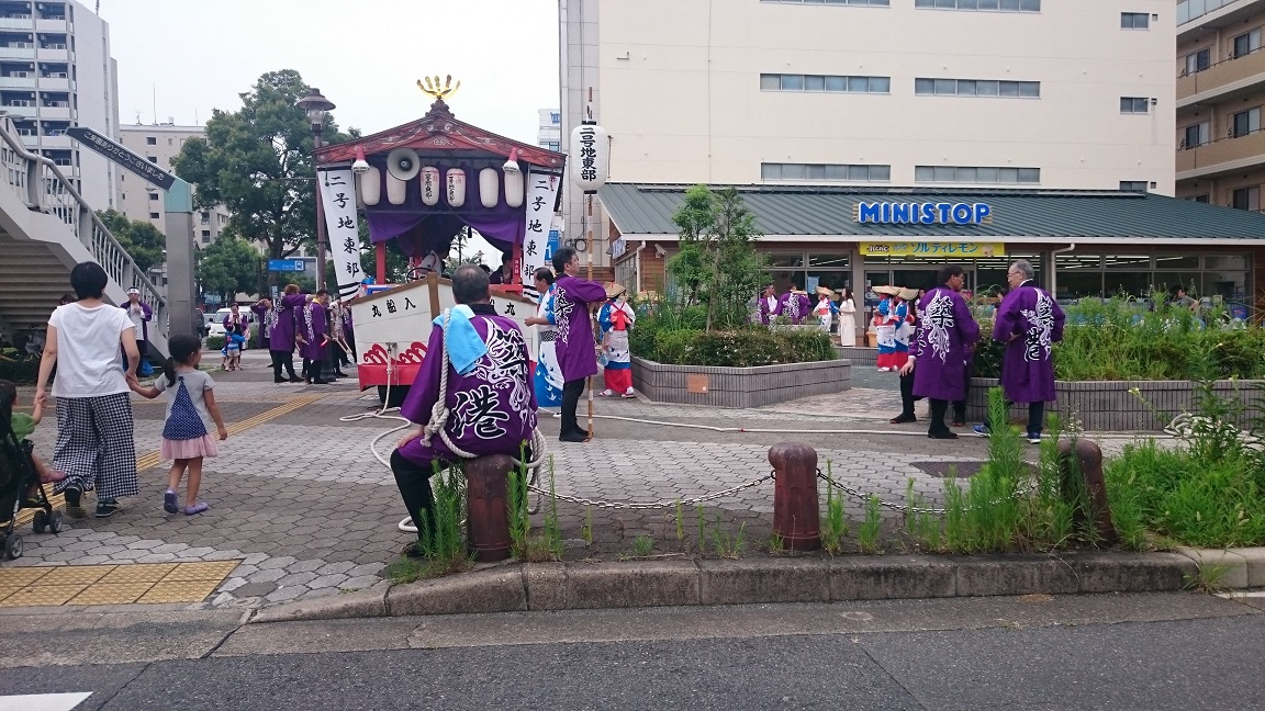 ミニストップのまえで2台が休憩、子供がお囃子を鳴らしていました。